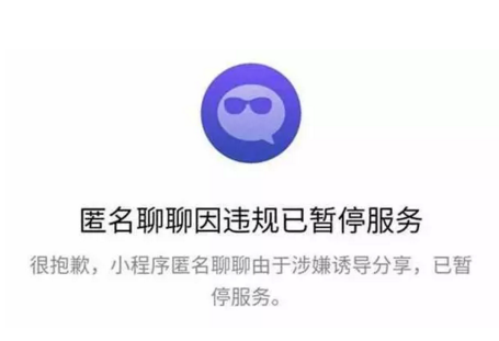 而几个月前的另一款刷屏小程序“匿名聊聊”就没这么幸运了。5月18日,“匿名聊聊”一度刷爆朋友圈,5小时达到1700万PV,但在19日凌晨,这款小程序已经暂停服务,显示的原因是“涉嫌诱导分享”。